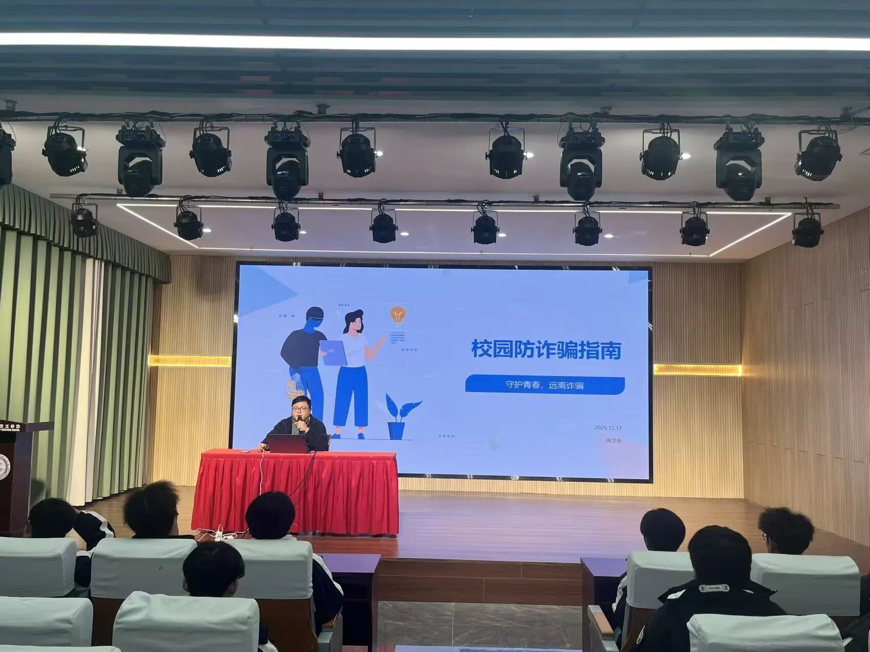 保卫处开展预防校园诈骗安全讲座,帮助全体师生认清刷单返利等各类电信网络诈骗的隐蔽套路,提升学生的风险识别能力与自我防范意识,引导学生树立正确的消费观与金钱观,筑牢校园反诈防骗的思想防线,保障师生的财产安全与合法权益,维护安全稳定、清朗有序的校园环境。